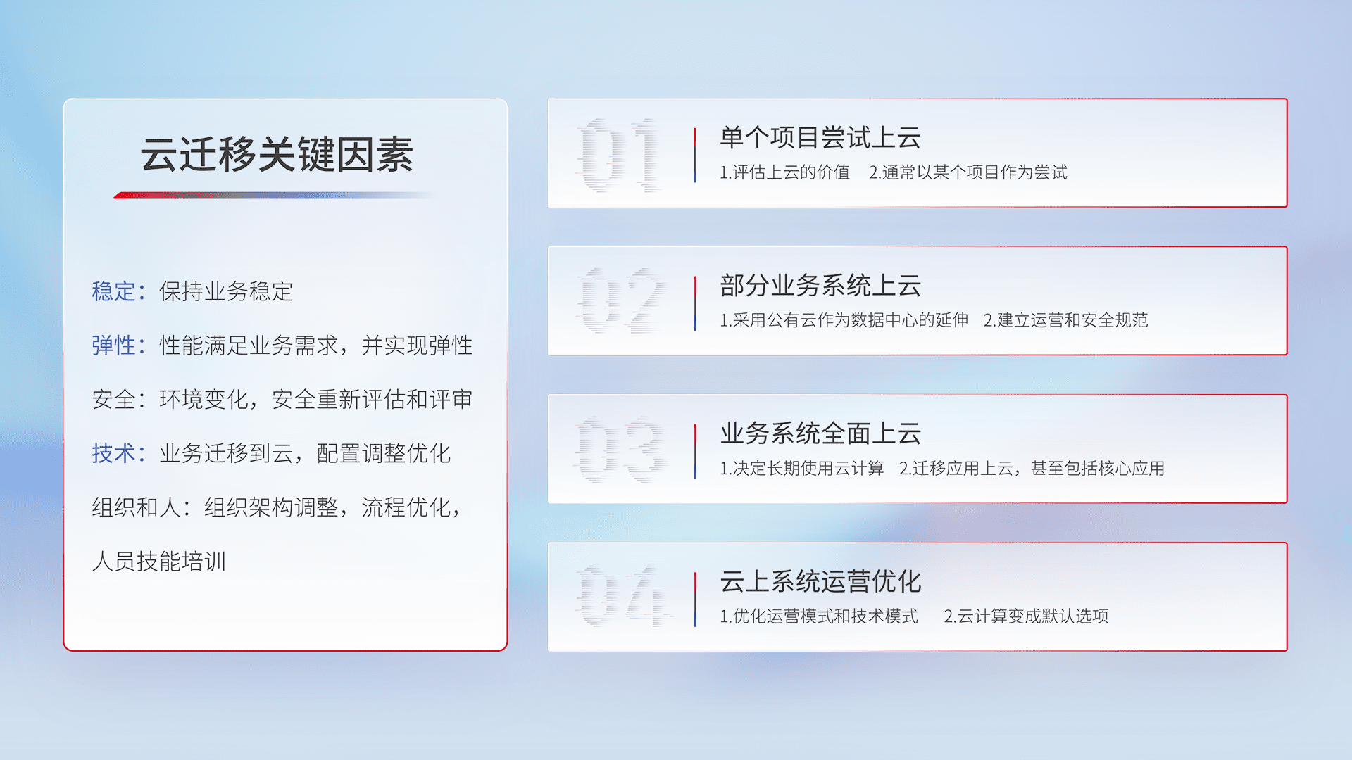 结合实际业务,,,从规划设计、、、、云平台选型、、云原生改造、、数据迁移、、、、集成交付,,,迁移全过程为客户识别最佳上云路径,,,做好风险识别管理,,设计网络架构、、、、身份权限、、、安全审计合规、、操作审计、、、、日志审计、、、监控告警策略、、、多站点容灾设计等,,对云上基础设施进行整体规划,,提升IT治理水平,,,以满足弹性、、、高可用、、高性能的需求。。。。