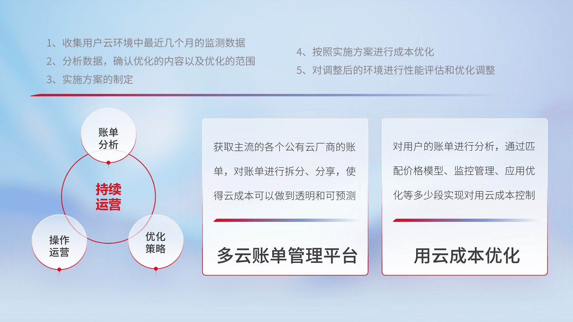 通过多云纳管,,以统一的资源数据模型把客户的云资源进行抽象和封装,,,进而实现对多云资源的统一操作,,,保障云资源管理的可靠性、、、稳定性与可用性。。。量身定制化运维内容,,配置、、、、开发运维、、、补丁管理、、、、备份、、监控、、认证和访问管理、、审计和日常巡检等,,保障在用云过程中的可靠度,,,,稳定度以及高可用率。。。